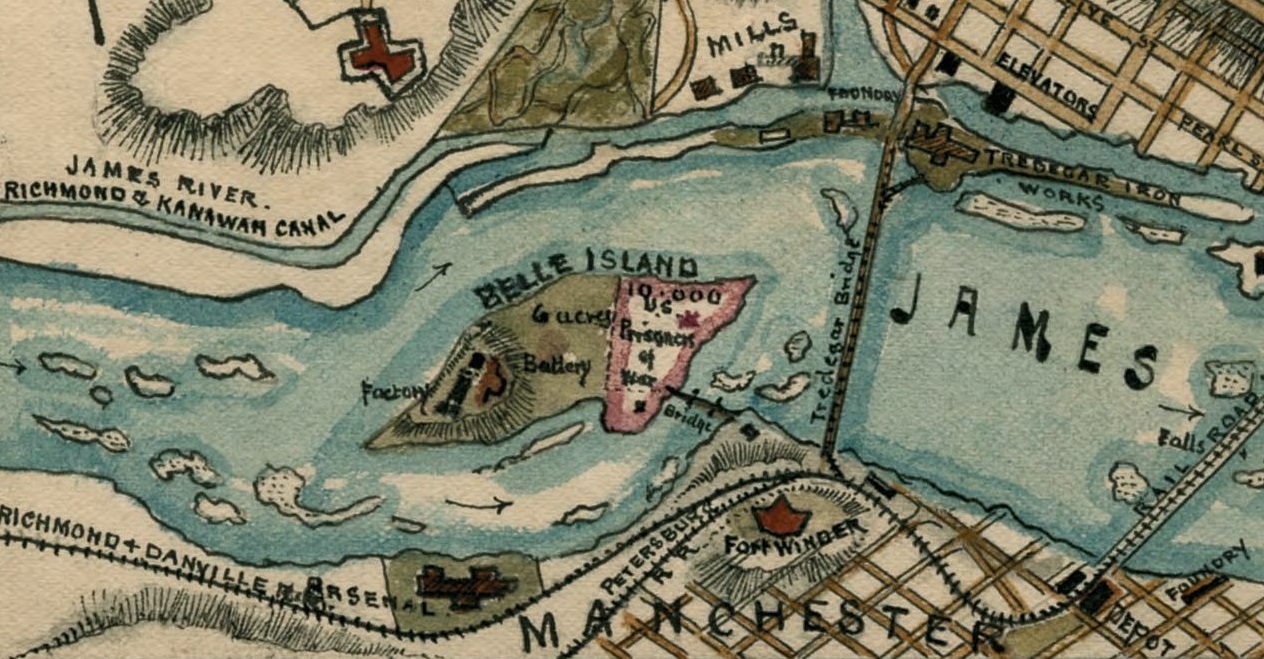 On to Richmond This trip was not a very enjoyable one. It was made mostly at night in boxcars with no seats. It was yet dark when we arrived at the capital of the Confederacy. We were ordered into line and marched in two ranks along the streets until we filed into an old tobacco warehouse standing on the bank of the canal, opposite what was called Castle Thunder. We remained there but a short time. During the forenoon our names, Company and Regiment, were taken and then we marched to Belle Isle. The march to the island seemed short and our minds and attention were occupied with the many objects of interest along the route. One of these was the famous Tredegar foundaries [sic], one of the most extensive in the Confederacy, in full blast turning out cannon, moulding shot and shell, and seemingly crowding the business to its utmost capacity.