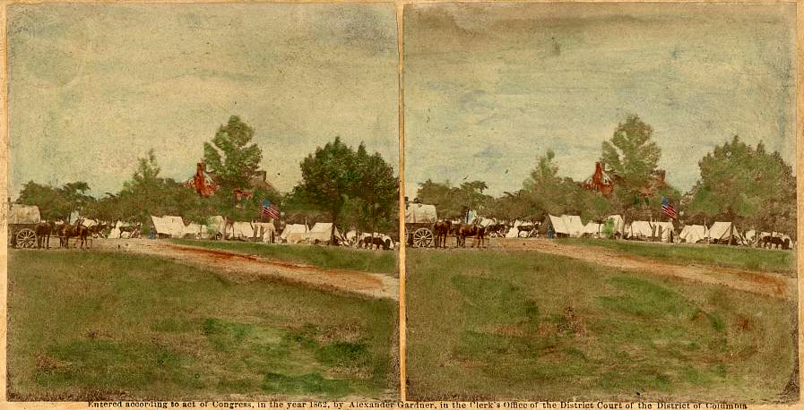 The sergeant surveyed the new street of tents. It was perfect. "That'll have to do, I guess. All right, you men get lumber from the quartermaster and put in floors." George had observed someone farther up the tree line go to relieve himself at the trees' edge. Now, before heading to the quartermaster's tent, George walked to a nearby tree, and unbuttoned his trousers fly. He was reaching into his trousers when the sergeant shouted right behind him, making George jump. "What do you think you are doin'?" "Um, just need to relieve myself... Sergeant." "We do not piss in our home like animals! You will report to the quartermaster, and obtain picks and shovels to dig sinks for your company." "Sergeant, I..." "Move!" The sergeant saw some other recruits loitering nearby and shouted, "You, too! You are on sink detail with him. Now, get going!" "Nope. We finished the wood floor in our tent, and I thought you boys looked like you could use some help. " They dug side by side. George grunted as he threw another shovelful, "War is not living up to my expectations." George, still standing near the trench, mumbled to Hez, "Oh. I thought we were to be buried in the trench we just dug." Hez chuckled. The boys gathered around the sergeant. "Report to the quartermaster. You will be issued gear and supplies." One boy excitedly asked, "Uniforms and sabers and guns?" The sergeant was not surprised by the question. "Not today. You need blankets, eating gear, soap, razors. After you've received your gear, stand ready for mess call." Someone asked, "What's that?" "Supper. Now go on. You know where the quartermaster is." Hez said, "Well, I guess we didn't enlist for the food. But this is decidedly a step down from my ma's cookin'." George scowled, "I have sampled the tables of good cooks and not so good ones, but this is many steps down from the worst I have had." A bugler played a spritely tune whose notes fell, and rose, and fell again. The Union flag (still showing stars for rebellious states) was lowered, then untied from the halyard. There were salutes, and then the honor guard departed. The boys broke ranks. Hez mused, "I wonder what we do now." Another recruit said, "Sarge says we are finished for today." As this was August, Retreat had occurred well before sundown. The boys were left on their own. One boy said, "I am tired! It has been a long day." Another said, "I need to wash up." Fellows started walking towards the tents. George said to Hez, "Do you hear that?" Hez said, "You mean that singing?" "Yeah. And men laughing." George looked at the street of tents, one of which was where he would sleep this night, then he looked at the other companies' streets, where campfires were coming to life. George looked back at Hez and said, "I may be tired, but I can't go make my bed. I might just lie on it, and that'd be that. Too early!" Hez agreed. "Let's go have a look." They walked towards the sound of the singing. They passed by several soldiers going to and from the nearby stream for washing. One fellow greeted them with a chuckle, "Hey, fresh fish. How'd you like your first day?" He didn't wait for an answer; just kept on walking. They came upon a couple of men playing a game with cards. Hez said, "Will ya look at that now." George was more interested in the group singing around a campfire, and kept walking. Hez caught up with him, and they came to the outskirts of the singing group as a song came to an end. George caught the eye of one fellow and asked, "How long you boys been here in camp?" "A couple weeks. I hear you boys are from Ithaca?" Hez answered, "That's right. How about you fellows?" "Lot of the boys in my company are from right here, Syracuse." George said, "I wasn't expecting our first day to have us putting up tents and digging a ditch." The fellow replied, "Well, that's the army for ya. A soldier has to build his own camp. Ain't nobody else gonna build it for ya." Hez asked, "When will we get uniforms, and guns?" George added, "And horses?" The fellow chuckled. "Don't know for sure. I saw a wagonload of uniforms come in this morning. Maybe they want to issue weapons when all the companies have been mustered. I hear tell we'll get horses after we get sent on to the next place." Hez asked, "The next place?" Another fellow joined in. "I hear we'll be goin' to New York City. To help keep things quiet, so there're no more riots like last month." The first fellow said, "Oh? I heard we'd be goin' to protect the Capital." George dubiously asked, "Albany?" "No, I mean Washington." George whistled, one eyebrow raised. Hez asked the fellows, "So what are we supposed to do here in Syracuse, without guns or horses?" The second fellow grinned. "Drill!" George asked, "Drill, what's that?" "Marchin'. Movin' as a group, real organized like." The first fellow agreed. "You'll be doin' a lot of that." Hez grumbled, "Sounds more like infantry than cavalry." Again a bugle rang out. George asked nobody in particular, "What's going on?" Somebody in particular replied, "That's tattoo. Time to retire for the night." George looked up and noticed that the sun had set, and the sky was beginning to darken. Hez said, "I can sleep anywhere, anytime, anyhow. You just watch me." A bugle sounded another call. George mused, "I wonder what that one means." Robert said, "I don't know." The level of sound in the camp died down. West conjectured, "Might mean 'shut up and go to sleep now.' Gettin' kinda quiet out there." George groused, "When are they gonna teach us what all these bugle songs mean? How are we supposed to just know..." Sergeant Johnson suddenly tore open the tent flap. He held a lantern, by whose light he could make out the faces of the tent's occupants. "That call is 'Lights Out,' and it means you must be quiet!" He pointed at George. "I remember you. You're that damn fool who pisses anywhere he damn well pleases. Well, I will be watching you. Now put those candles out and go to sleep." After he walked away, shushing