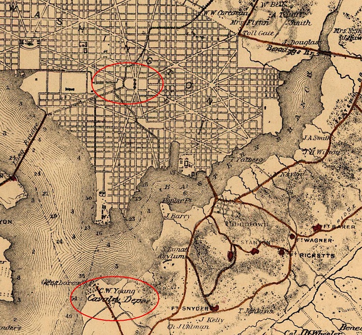 Not long after, the column entered bustling Camp Stoneman. Army tents, horse corrals, stables, all manner of buildings. Beyond could be seen the wide Potomac. Somebody said, "That's Virginia over yonder!"