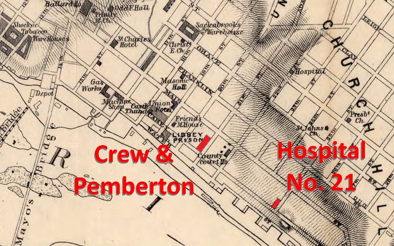 A week after his capture, Nathan arrived in Richmond. He had an ugly pus-ridden lump on the side of his head, and he couldn't hear on that side. He'd been made to ride a mule part of the way to Richmond; the mule's front-to-back ride had been very rough on Nathan's groin. It had been a long, bumpy, and painful ride. But the most serious thing was that he'd come down with dysentery. The receiving officer in Richmond could see how sick Nathan was, so instead of prison, sent him straight to Hospital 21, at the corner of 25th and Cary. Nathan's head wound was cleaned, and a clot of blood removed from his ear canal, after which his hearing returned. For the dysentery, he was given fresh food. And daily turpentine. In spite of this treatment, Nathan's condition improved after three days.