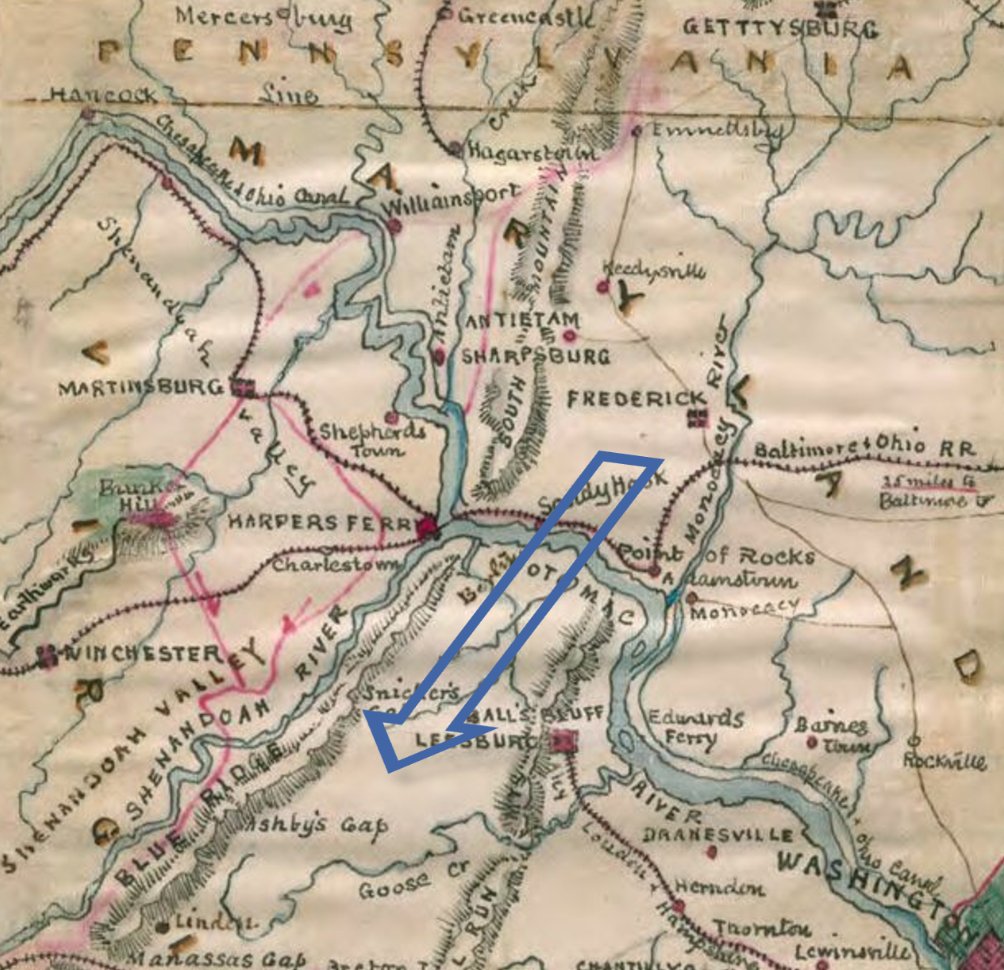 Wouldn't you know it, orders came on the 16th to prepare for a night march. Nathan was still catching up on current events. "Where do you suppose we're heading?" "Marse Robert has the rebs marching up the Shenandoah Valley, and we're maneuvering to catch him. That's the word, anyway." "So the rebs got across the Potomac." "Sure, haven't you been reading the papers?" "I wanted to get as far from the war as I could. I didn't even want to know the rebels were trapped at the river, but everybody wouldn't shut up talkin' about the war. So we didn't attack? We just let him get away?" "You have an accurate understanding of the situation." After marching all night, Meade's army crossed the Potomac at Berlin.* The march then continued south through Loudoun County. As Lee's army marched south in the Shenandoah, Meade's army paralleled the move on the east side of the Blue Ridge.